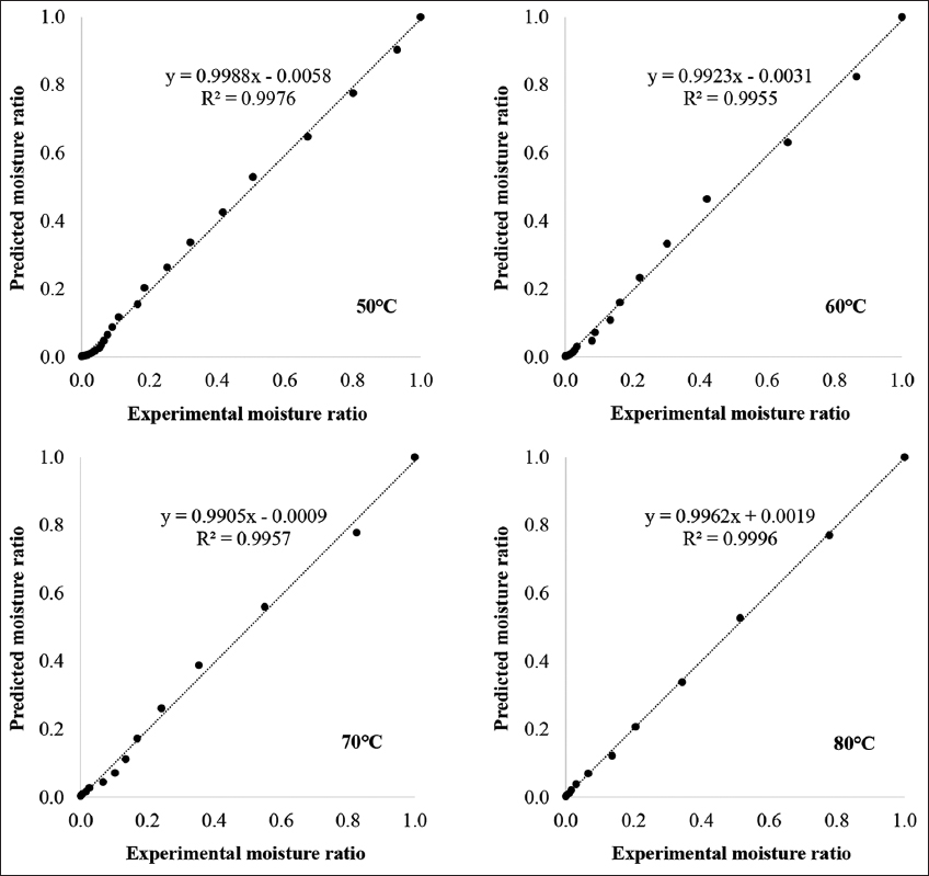 The appropriateness of the moisture content data over the drying time to eight popular drying models [Table 1] was then evaluated. The findings of the statistical analysis were displayed in Table 2. All of the R2 values were higher than 0.98, suggesting that all of the models fit well. The suitability of the model was also assessed based on the χ2 and RMSE values. In general, the R2, χ2, and RMSE values ranged from 0.9806 to 0.9995, 0.0000567 to 0.0019202, and 0.0075356 to 0.0459555, respectively. The calculation results indicated that the Page model provided a better fit than other models at all drying temperatures, with R2 > 0.995, χ2 < 0.0006, and RMSE < 0.03. The graph in Figure 2 demonstrates the fit between the Page model and the experimental results at temperatures of 50°C, 60°C, 70°C, and 80°C. The reliability of the Page model was also assessed by comparing the calculated MR at different drying temperatures with the values obtained from the experimental data. The data values fluctuated close to a straight line with a 45°C slope, according to the results of the linear regression analysis. These findings indicated that the Page model was appropriate for explaining the convection drying process of OS, as evidenced by the data obtained at 80°C, which had an R2 value of 0.9996. Similarly, the R2 values at the remaining temperatures (50°C, 60°C, and 70°C) were 0.9976, 0.9955, and 0.9957, respectively [Figure 3]. Silva et al. [46] used forced air flow to dry niger seeds at 40–80°C. They then compared mathematical models to the experimental data and found that the Page model best described the data, with an R2 value fluctuating between 0.98 and 0.99. When evaluating the drying kinetics of pumpkin seeds at 40–70°C in an oven with forced air circulation, de Oliveira et al. [44] also found that the same model worked well with R2 values ranging from 0.9942 to 0.9969. In comparison to the drying of niger seeds and pumpkin seeds, the R2 values derived from the Page model for OS were greater, further confirming that this model works particularly well for OS compared to some other seeds. The Page model is almost the empirical model equation that has been used most frequently in the investigation of water migration during drying. Page has been known to be successful at fitting the diffusion phenomena, which could be one explanation. In addition, by including the variable “n” in the empirical equation, the Page model makes up for the deficiency of the exponential model [48].