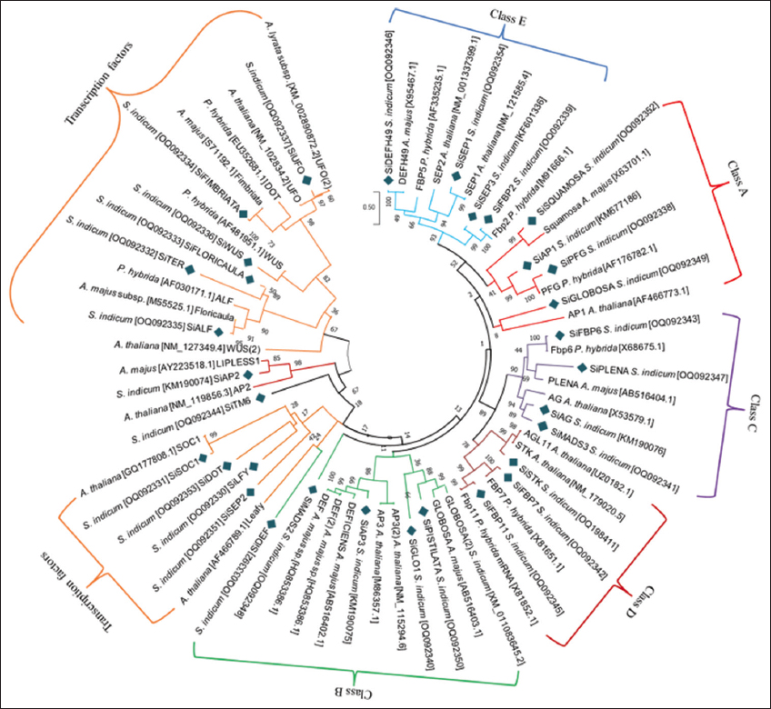 To analyze the evolutionary relatedness of the detected homeotic genes of sesame with the reported floral organ genes identified from the model plants – A. thaliana, A. majus, and P. hybrida, a phylogenetic tree was constructed with the cDNA sequences of 67 homeotic genes, including the 32 potential genes from sesame detected in this study [Figure 1]. The study revealed homology-based grouping of all sesame homeotic gene sequences with their orthologous gene sequences from A. thaliana, A. majus, and P. hybrida. The sesame homeotic gene sequences were functionally categorized into five classes of the ABCDE model of flower development. These clusters comprised four gene homologs grouped as Class A, seven as Class B, four as Class C, three as Class D, five as Class E, and nine as the putative TFs, as discussed in section 3.1 of results and discussion, indicating their potential role in floral gene regulation. Previous studies also revealed that most organ identity genes are regulated at the mRNA level, possibly through direct transcriptional control. The floral homeotic control genes appear to encode transcription factors [28].