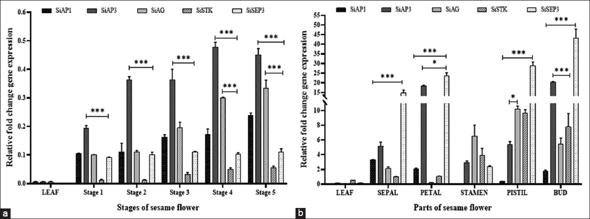 The genome database of sesame (S. indicum L.) (tax id: 4128) available in the National Center for Biotechnology Information (NCBI) was utilized for putative floral homeotic genes. The reported sequences belonging to the MADS-box family in the model plants—A. thaliana, A. majus, and P. hybrida were searched by BLASTn in the sesame database program (https://www.ncbi.nlm.nih.gov/datasets/genome/GCF_000512975.1/). The homologous gene sequences were aligned using Clustal Omega (European Bioinformatics Institute, Cambridge, UK). Gene sequences with nucleotide homology ≥ 80% were selected. The biological function of these sequences was predicted using InterPro and BLASTP tools. The subcellular localization of these homologous sequences was predicted using the LOCALIZER tool (https://localizer.csiro.au/). The putative promoters were detected using the Promoter-2.0 tool (https://services.healthtech.dtu.dk/services/Promoter-2.0/).