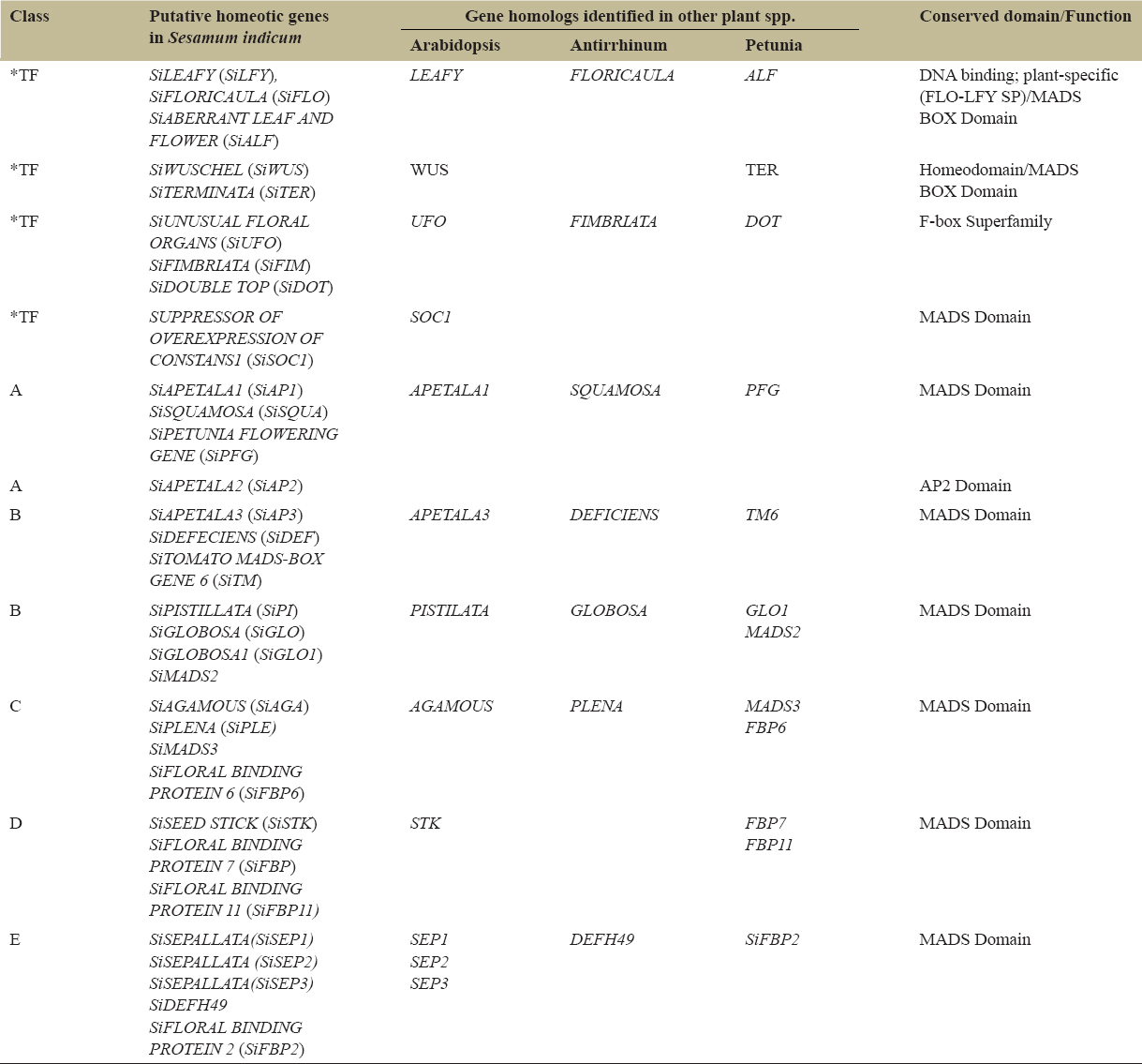 | Class | Putative homeotic genes inSesamum indicum | Gene homologs identified in other plant spp. | Conserved domain/Function | ||