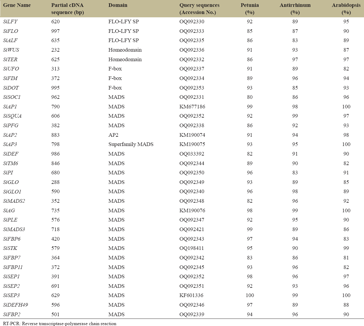 Table 3: The partial cDNA sequences of the 32 putative homeotic genes in sesame obtained through RT-PCR-based gene expression, along with their accession numbers, domains, and nucleotide similarity with reported homeotic genes from other model plant species.