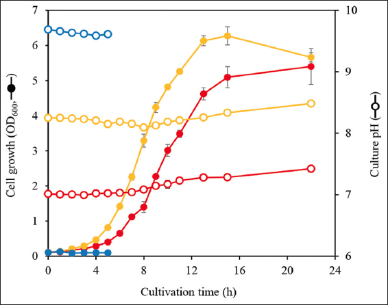 | Figure 2: Effect of culture pH on growth of Corynebacterium ammoniagenes NBRC 12071. The strain was cultivated in IFO 802 medium supplemented with 0.1 M MOPS (pH 7.0, red), tricine-NaOH (pH 8.5, yellow), or CAPS (pH 10.0, blue). Solid symbols, cell growth (OD600); open symbols, culture pH. The cultivation at pH 10.0 was stopped at 5 h because the strain showed no growth. This cultivation was performed in triplicate, and the average was represented with error bars indicating the standard deviations.