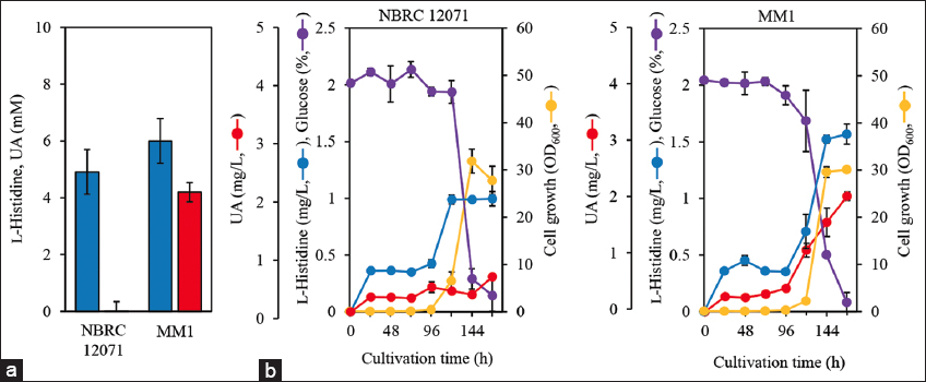 | Figure 3: (a) Production of urocanic acid (UA; red bars) from 10 mM L-histidine (blue bars) in the resting cells of Corynebacterium ammoniagenes NBRC 12071 and MM1. The cells were resuspended in 0.1 M sodium phosphate buffer (pH 7.0) containing 10 mM L-histidine at OD600 of 5.0 and then incubated for 3 days at 30°C with shaking. This assay was performed in triplicate, and the average was presented with error bars representing standard deviations. (b) Cell growth and L-histidine and UA production from 2% glucose in the growing cells of C. ammoniagenes NBRC 12071 and MM1. The cells were inoculated to 50 mL minimum medium supplemented with 2% glucose at OD600 of 0.1 and then cultivated for 7 days at 30°C with shaking. Red, UA concentration; blue, L-histidine concentration; yellow, cell growth (OD600); purple, glucose concentration. This cultivation was performed in duplicate, and the average was represented with error bars indicating the standard deviations.