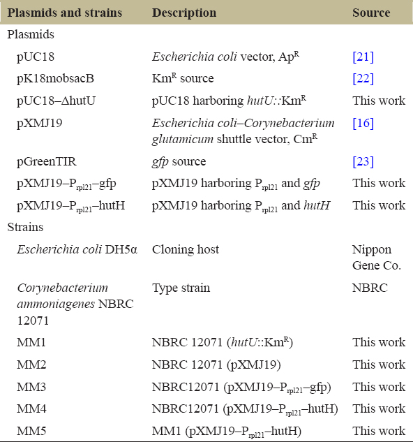| pXMJ19–Prpl21–hutH | pXMJ19 harboring Prpl21 andhutH | This work |