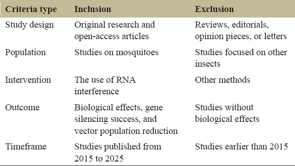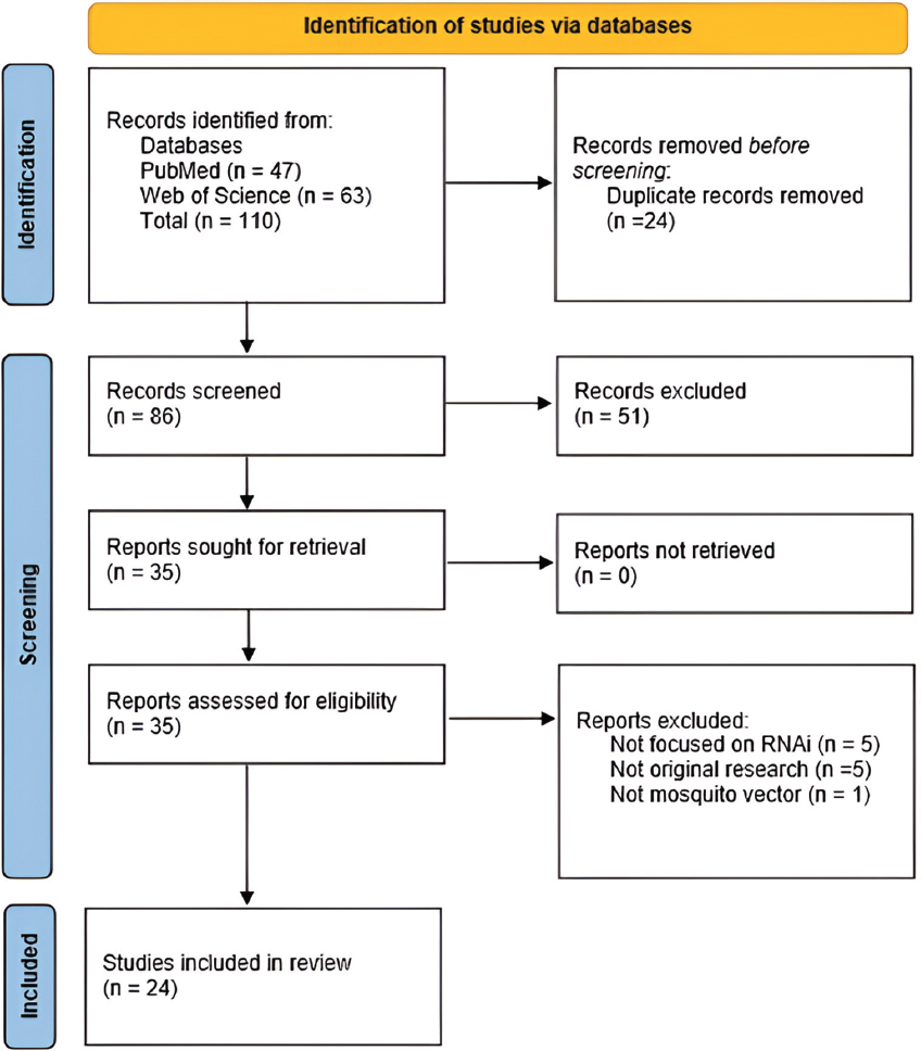 Lack of standardization: There was variability in mosquito strains, developmental stages, gene targets, dsRNA doses, and delivery methods across all the analyzed studies. This complicates drawing broad conclusions, comparing efficacy, or designing protocols for RNAi research. These variations could also be the cause of the differences in gene knockdown efficiency and mortality outcomes