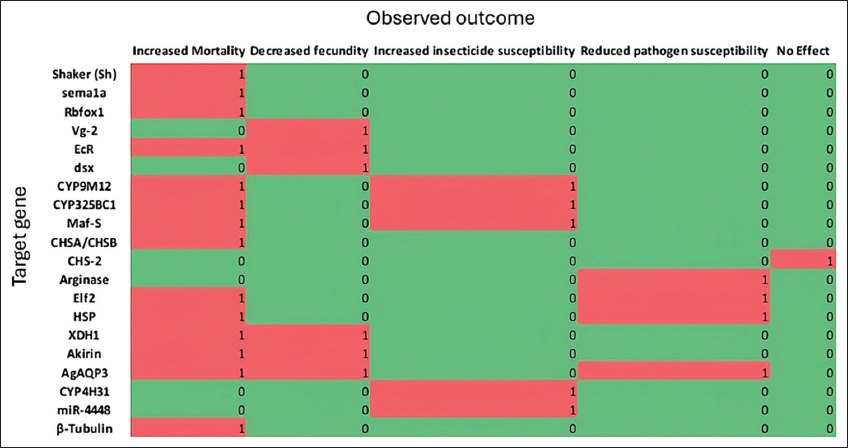 The majority of the studies analyzed showed success in targeting specific genes across the three developmental stages of mosquitoes. Research on neural genes, particularly Shaker, sema1a, and Rbfox1, showed that silencing them induced mortality in both larvae and adult mosquitoes [Figure 3], demonstrating their important roles in mosquito survival [20,25,26,42]. Similarly, cytochrome P450 genes, involved in insecticide detoxification, such as CYP9M12, CYP325BC1, and the transcription factor Maf-S, were effectively silenced using interfering RNA. This process ultimately resulted in increased insecticide susceptibility [30,31]. In addition to the identified gene targets, reproductive and immune regulatory genes such as Vg-2, EcR, dsx, Elf2, and HSP were also targeted by interfering RNA, resulting in reduced fecundity, impaired oogenesis, decreased pathogen susceptibility, and increased mortality in mosquito vectors [27,28,35,43,44]. These studies have revealed that RNAi can be applied not only to impair mosquito development but also to decrease their chances of being infected by various pathogens.