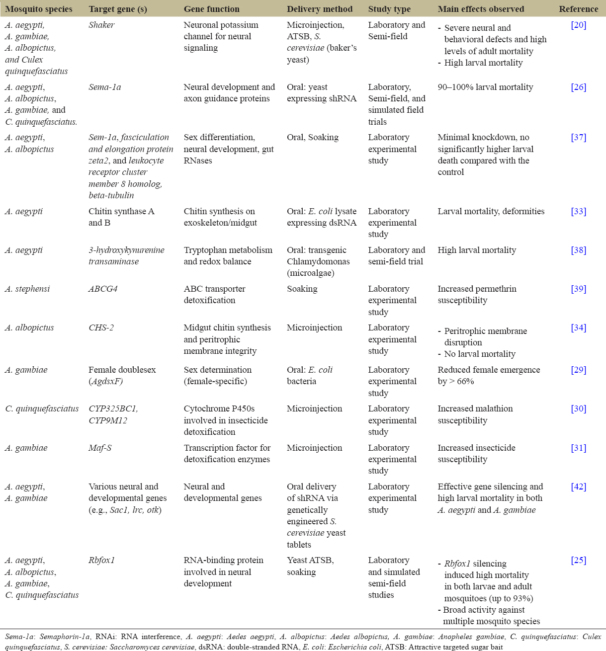 Innovative delivery systems such as ATSBs-dsRNA and transgenic RNAi expression systems have been explored in some studies. Williams et al. [41] and Mysore et al. [25] found that these methods demonstrated high effectiveness in inducing gene knockdown and mosquito mortality. However, to fully adopt these approaches, thorough field validation, biosafety assessments, including their impact on non-target organisms, and regulatory measures are necessary before real-world implementation.