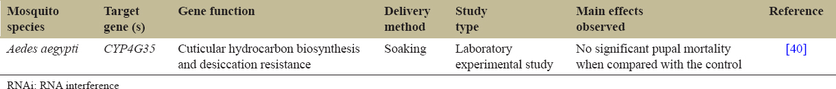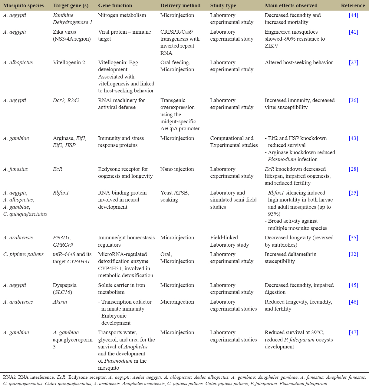 7. Yadav M, Dahiya N, Sehrawat N. Mosquito gene targeted RNAi studies for vector control. Funct Integr Genomics. 2023;23(2):180.[CrossRef]