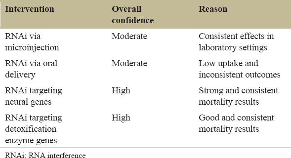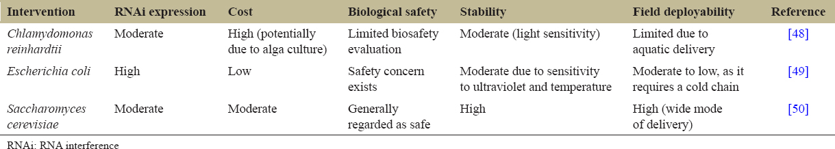 | Intervention | RNAi expression | Cost | Biological safety | Stability | Field deployability | Reference |