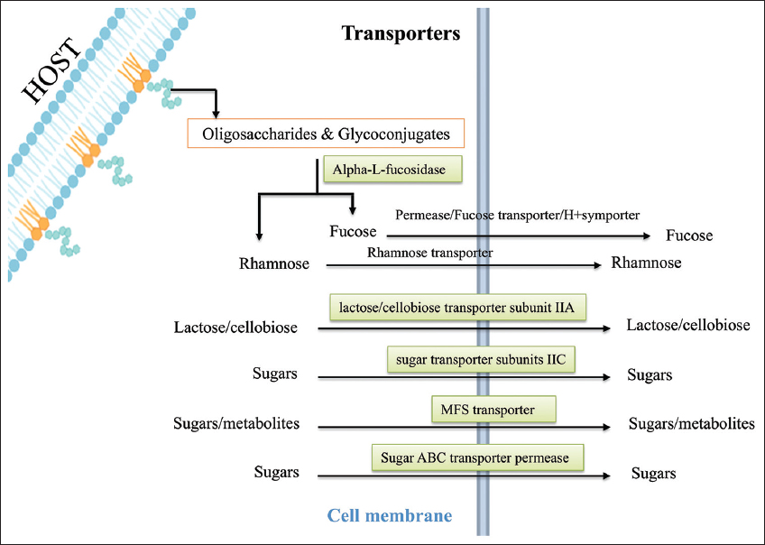 The study identified transcription regulators that activate enzymes, transporters, and energy-related genes that manage energy production. The enzymes such as alpha-L-fucosidase (CCPI-G59) and glycoside hydrolase family 16 protein (CCPI-G60) break down polysaccharides [Figure 5]. Gut microbes produce fucosidases [48-51], cleaving fucose from host glycans (free oligosaccharides and glycoconjugates) to maintain intestinal homeostasis [52,53]. This outcome also ensures additional carbon sources to microbes for energy production, even under oxygen-limited conditions in anaerobic respiration. Transporters are crucial for nutrient uptake, which sustains the bacterium during infection. The major facilitator superfamily (MFS) transporter (CCPI-G76) facilitates the uptake of sugars and possibly other metabolites from the host [Figures 4 and 6, Supplementary Figure 3]. FucP and its homologues belonging to the MFS family transported L-fucose across cell membranes in a pH-dependent manner [54-56].