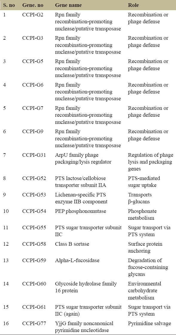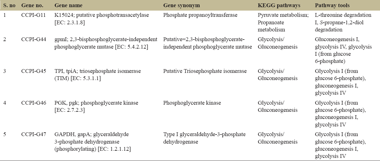 The helix-turn-helix transcriptional regulator (CCPI-G40, G41) and multiple antibiotic resistance regulator (MarR) family regulators (CCPI-G75), belonging to the family winged helix-turn-helix, activate genes necessary for pathogenicity and stress response [Figure 4]. This helps the bacterium to adapt its metabolism and defense mechanisms to the nutrient-limited, anaerobic conditions within the host. The MarR protein is essential for diverse biological functions, which are crucial to the survival of pathogenic bacteria. The functions include resistance to multiple antibiotics, regulation of virulence-associated traits, virulence genes, hemolytic activity, extracellular protease activity, and motility [42-44]. The signaling molecules or ligands that activate the transcriptional regulator MarR are small phenolic compounds, metal ions, small peptides, and oxidative stress [45]. The repressor, open reading frame, kinase (ROK) family transcriptional regulators (CCPI-G56) are characterized by carbohydrate-sensing domains shared with sugar kinases, and the ROK family transcriptional regulator modulates pathways involved in carbohydrate metabolism, fine-tuning energy production to the available substrates in host tissues [Figure 4].