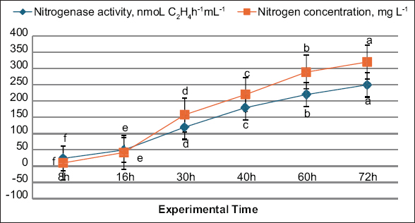 | Figure 2: Nitrogenase activity of strain L-1 as assessed by acetylene reduction and nitrogen content. Distinct letters (a-f) denote statistically significant differences at P < 0.01. [Click here to view] |