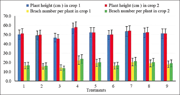 | Figure 3: Effects of Enterobacter mori cjy13 and Streptomyces globosus CAU 1564 on average plant height and branch number at 65 days after sowing (DAS) in both experimental years. Note: Plant height and branch number were monitored on 20 plants per replicate at 65 DAS for both 2024 and 2025. [Click here to view] |