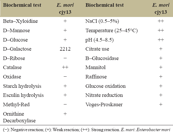 Table 1: The physical and chemical characterization of E. mori cjy13.