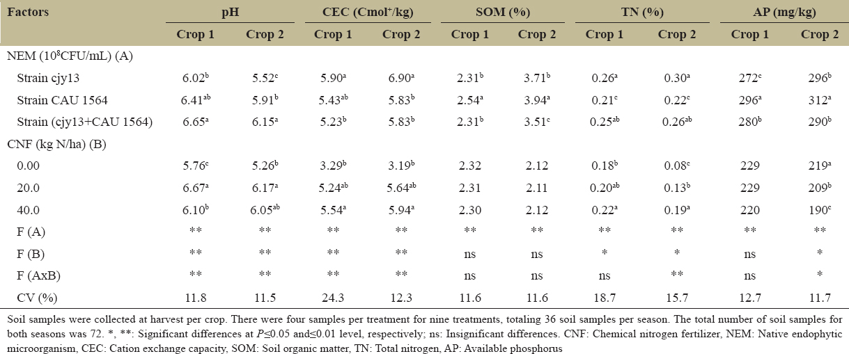 Table 2: Effects of strain cjy13 and strain CAU 1564 combined with CNF rates on soil chemical properties on both crops.