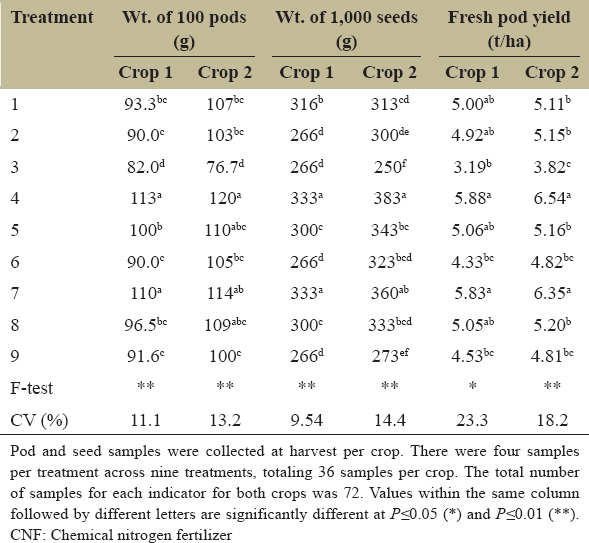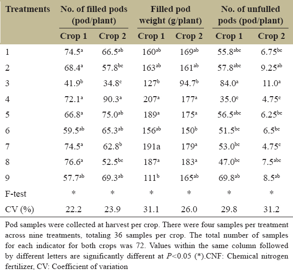 | Treatments | No. of filled pods (pod/plant) | Filled pod weight (g/plant) | No. of unfilled pods (pod/plant) | |||