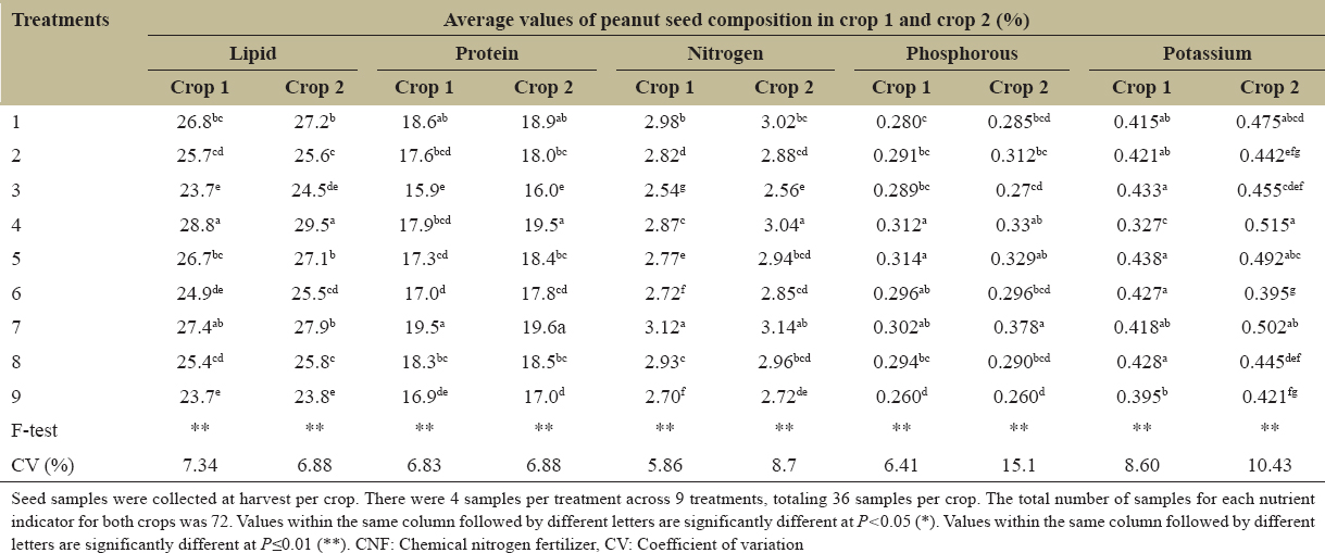 Seed samples were collected at harvest per crop. There were 4 samples per treatment across 9 treatments, totaling 36 samples per crop. The total number of samples for each nutrient indicator for both crops was 72. Values within the same column followed by different letters are significantly different at P<0.05 (*). Values within the same column followed by different letters are significantly different at P≤0.01 (**). CNF: Chemical nitrogen fertilizer, CV: Coefficient of variation