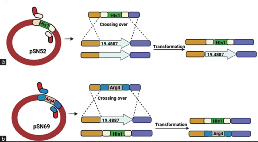 | Figure 1: Schematic representation of CaECM21 (ORF19.4887) gene deletion and generation of the homozygous knockout strain in Candida albicans. (a) The first allele of CaECM21 was disrupted using a deletion cassette derived from plasmid pSN52 carrying the HIS1 marker. Homologous recombination in the BWP17 strain replaced one copy of the CaECM21 locus with HIS1, and transformants were selected on SD medium lacking histidine and verified by diagnostic polymerase chain reaction (PCR). (b) The second allele was deleted using a cassette from plasmid pSN69 containing the ARG4 marker, transformed into the heterozygous strain. Transformants were selected on SD medium lacking arginine, and successful homozygous deletion mutants were confirmed by PCR analysis.