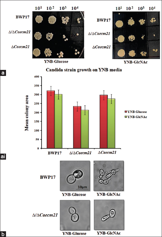 To assess the role of CaEcm21 in C. albicans growth on glucose and GlcNAc media, spot assays were performed using the wild-type strain BWP17, double mutant (?/?Caecm21), and complemented strains (?Caecm21) [Figure 5a]. All strains were able to grow under both conditions, while Δ/ΔCaecm21 strains showed reduced growth both on glucose and GlcNAc plates, as shown in the bar diagram [Figure 5ai] and the statistical analysis [Table 4, P < 0.0001]. This indicates a condition-specific contribution of CaECM21 to nutrient adaptation.
