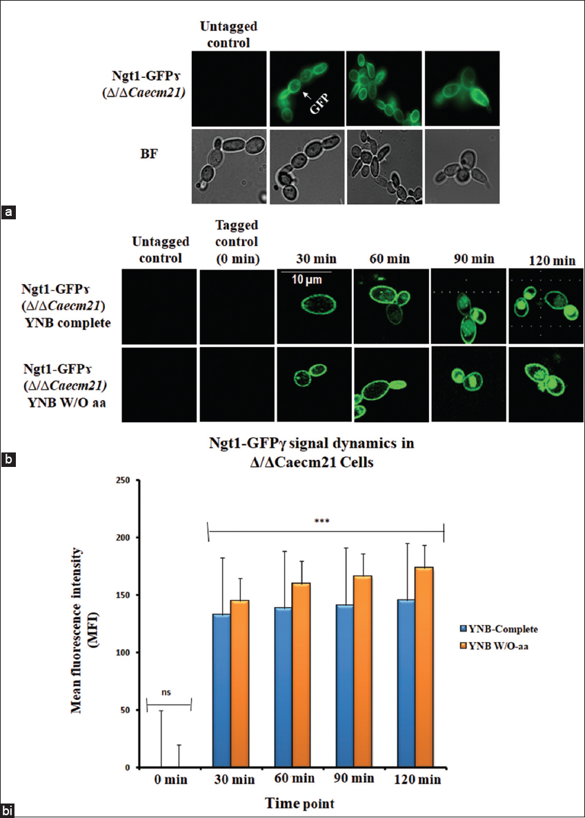 To investigate the time-dependent relocalization of Ngt1 in Δ/ΔCaecm21 cells, cultures were grown overnight and incubated with YNB-GlcNAc and YNB W/O aa-GlcNAc conditions. All fluorescence pictures were observed under the epifluorescence microscope at different time intervals. Importantly, no detectable fluorescence was observed in untagged strains, confirming that signals originated specifically from GFP-tagged transporters. Tagged mutant strains at 0 min served as negative controls and showed no signal. Interestingly, between 30 and 60 min, fluorescence appeared at the plasma membrane, indicating transporter activation. At 90 min, internal puncta were visible, and at 120 min, fluorescence was predominantly vacuolar, suggesting endocytic trafficking [Figure 6b].