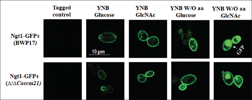 To determine whether membrane transporters’ localization correlates with CaECM21 predicted role in endosomal trafficking of nutrient transporters, the fusion protein was examined under GlcNAc-inducing conditions (YNB-GlcNAc) using fluorescence microscopy. Under these conditions, Ngt1-GFPγ localized predominantly to the plasma membrane [Figure 6a]. These observations provide the first experimental evidence for GlcNAc-dependent plasma membrane localization of Ngt1 in C. albicans and are consistent with previous studies employing similar GFP-tagging approaches [34].