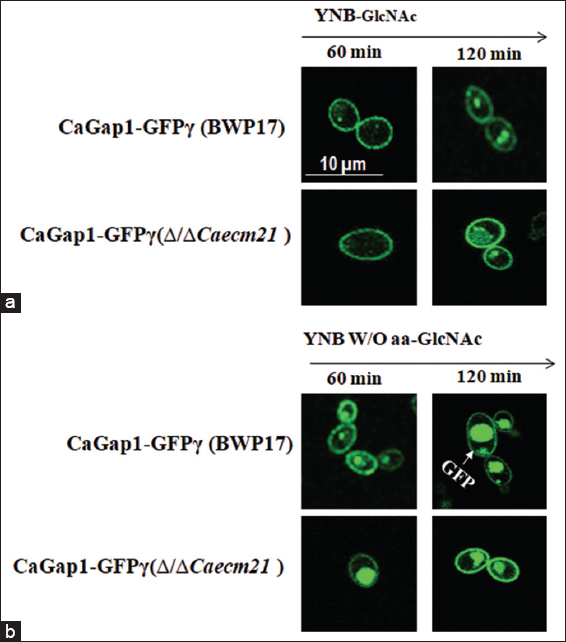 To investigate the effect of nutrient conditions on CaGap1 localization and to assess the role of CaECM21, wild-type (BWP17) and Δ/ΔCaecm21 strains carrying CaGap1-GFPγ were cultured overnight in YPD at 30°C. Cells were washed twice with YNB basal medium and resuspended in YNB supplemented with both 2% glucose and 2% GlcNAc, with or W/O aa [32]. Untagged strains were used as negative controls to exclude autofluorescence, and images were processed using ImageJ [Figure 7].