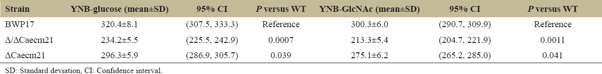 | Strain | YNB-glucose (mean±SD) | 95% CI | P versus WT | YNB-GlcNAc (mean±SD) | 95% CI | P versus WT |
