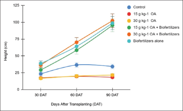 Figures 1 and 2 present the effects of organic amendments and biofertilizer applications on the height of C. pubescens 3 months after planting. Plant height differed significantly between biofertilizer-treated and untreated plants. At 1 month after planting, uninoculated plants (without biofertilizers) were shorter, averaging 19.11 cm. In contrast, biofertilizer application, regardless of the organic amendment rate, significantly increased plant height to 34.83 cm – an 82% improvement compared to the uninoculated plants.