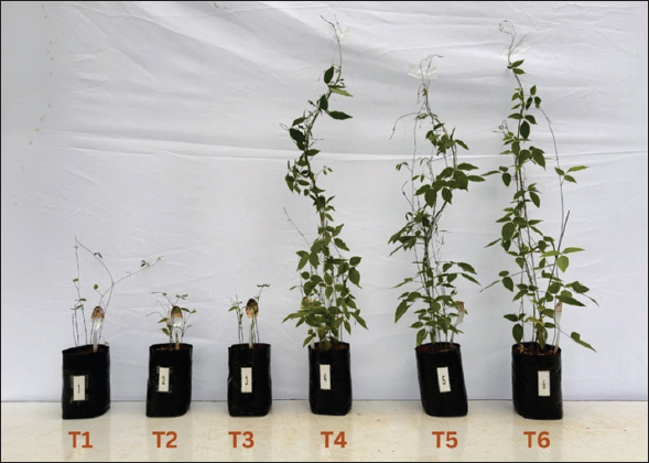 | Figure 2: Plant height of Centrosema at 3 months as affected by organic amendments and biofertilizers. T1 - 0 g/kg (Control), T2 - 15 g/kg organic amendments, T3 - 30 g/kg, T4 - 15 g/kg organic amendments+biofertilizers, T5 - 30 g/kg organic amendments+biofertilizers, T6 - Biofertilizers alone. [Click here to view] |
