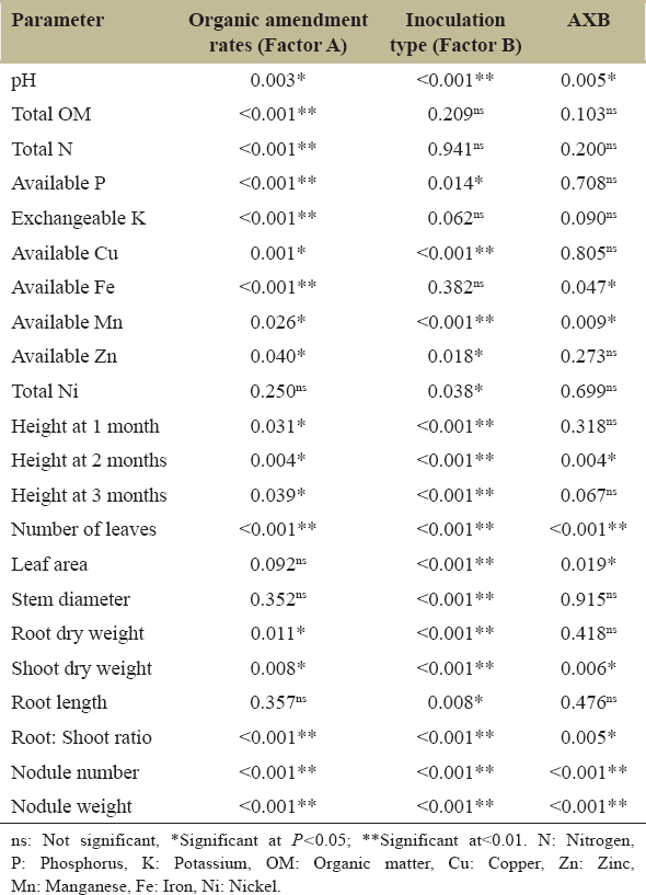 | Parameter | Organic amendment rates (Factor A) | Inoculation type (Factor B) | AXB |