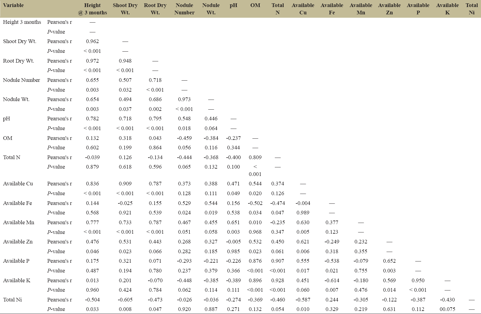 | Variable | Height @ 3 months | Shoot Dry Wt. | Root Dry Wt. | Nodule Number | Nodule Wt. | pH | OM | Total N | Available Cu | Available Fe | Available Mn | Available Zn | Available P | Available K | Total Ni | |