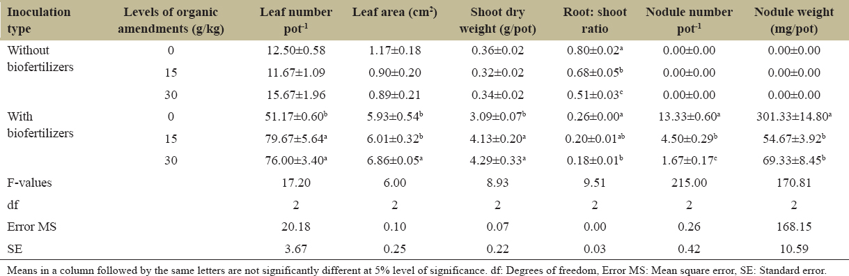| Inoculation type | Levels of organic amendments (g/kg) | Leaf number pot-1 | Leaf area (cm2) | Shoot dry weight (g/pot) | Root: shoot ratio | Nodule number pot-1 | Nodule weight (mg/pot) |