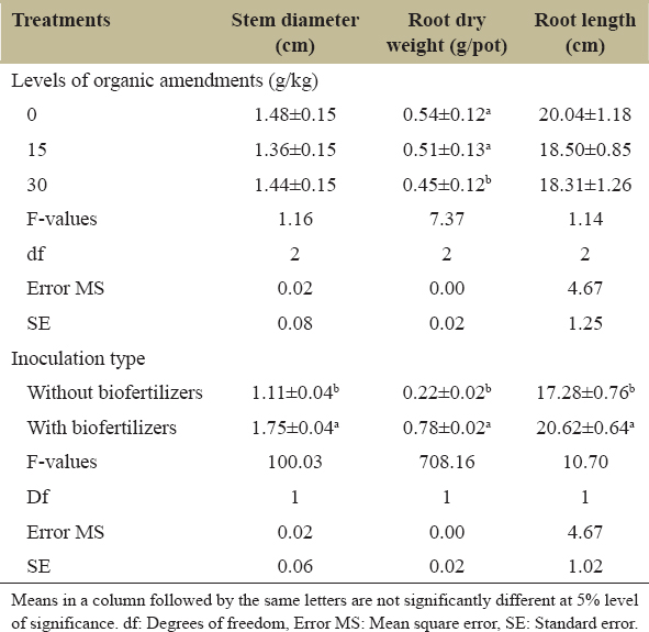 Table 7: Effects of organic amendments and biofertilizer applications on stem diameter, root dry weight, and root length of Centrosema.