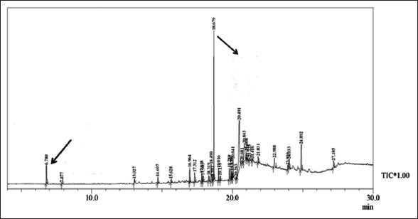 For the detection of metabolites produced during the dual culture assay, P. fluorescens MS-05 was analyzed further by Gas Chromatography and mass spectrometry (GC-MS) technique as described by Abed et al. [16]. The GC–MS analysis was carried out using an Agilent 7890A Gas Chromatograph coupled with a 5975C Mass Selective Detector. Separation of metabolites was achieved on an HP-5MS capillary column (30 m × 0.25 mm × 0.25 μm film thickness). Helium was used as the carrier gas at a constant flow rate of 1.0 mL/min. The injector temperature was set at 250°C, the injection volume was 1 μL, and the split ratio was 10:1. The oven temperature program started at 60°C (2 min hold), increased to 280°C at 10°C/min, and was held for 10 min. The ionization mode was electron impact (EI) at 70 eV, and mass spectra were recorded over the m/z range 50–600. Compound identification was performed by comparing retention times and mass spectra with those in the NIST 14 library and with authentic standards of DAPG and phenazine-1-carboxylic acid (PCA). Briefly, P. fluorescens MS-05 was cultured in nutrient broth medium (Hi-media) in Erlenmeyer flasks, the flasks were placed on a rotary shaker incubator at room temperature (approximately 25–30°C) with 110 rpm for 7 days. Further, the culture broth was filtered, and the filtered substances were mixed separately with chloroform and ethanol absolute (research grade) in a 1:1 ratio. The addition of chloroform resulted in the formation of two layers in the culture broth; the solvent layer was separated using a separating funnel and stored in sterile vials. The ethanol-added culture broth was kept as an aqueous extract.