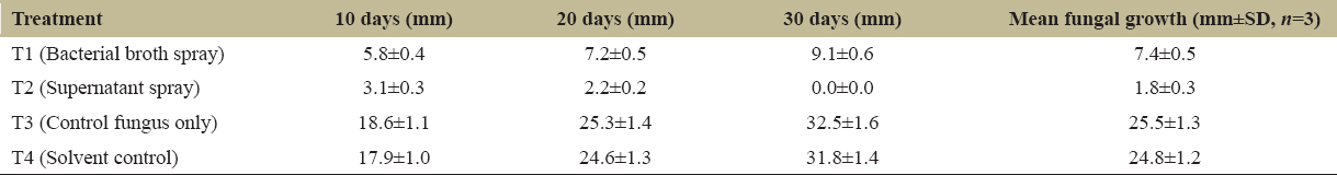 | Treatment | 2nd day (mm) | 5th day (mm) | 7th day (mm) | Mean zone of inhibition (mm±SD, n=3) |