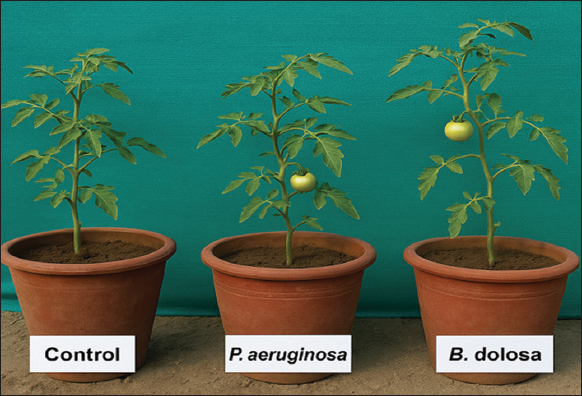 | Figure 1: Greenhouse pot experiment evaluating the effect of plant growth-promoting rhizobacteria inoculation on tomato growth. Three treatments were used: uninoculated control, Pseudomonas aeruginosa, and Burkholderia dolosa.