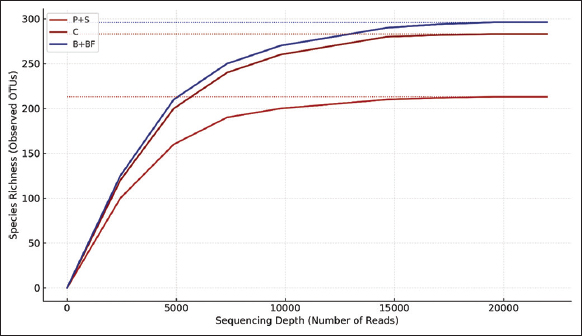Rarefaction analysis showed that all samples reached a saturation point, indicating sufficient sequencing depth for diversity estimates [Figure 2]. Alpha diversity indices, including the Shannon diversity index and Chao1 richness estimator, were computed and compared across treatments. One-way ANOVA followed by Tukey’s HSD post-hoc test revealed that alpha diversity was significantly higher (P < 0.05) in PGPR-inoculated soils compared to the control. The highest Shannon index was observed in the B. dolosa (T2) treatment, indicating greater microbial richness and evenness.