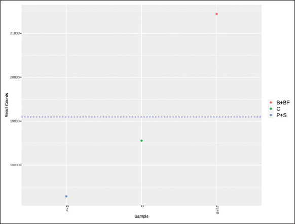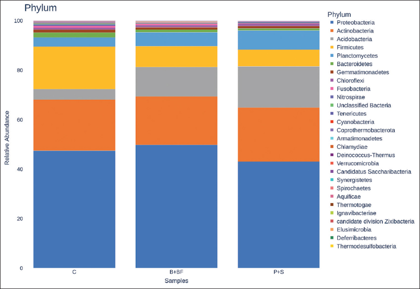 Metagenomic sequencing of three rhizospheric soil samples Control (C), Burkholderia-inoculated (B+BF), and Pseudomonas-inoculated (P+S)—generated approximately 0.2 million high-quality paired-end reads per sample, with an average GC content of 57.5–58% [Table 2]. Quality control was performed using FastQC (v0.11.2) and summarized through MultiQC (v1.9). DNA purity was confirmed by A260/280 ratios between 1.8 and 2.0.