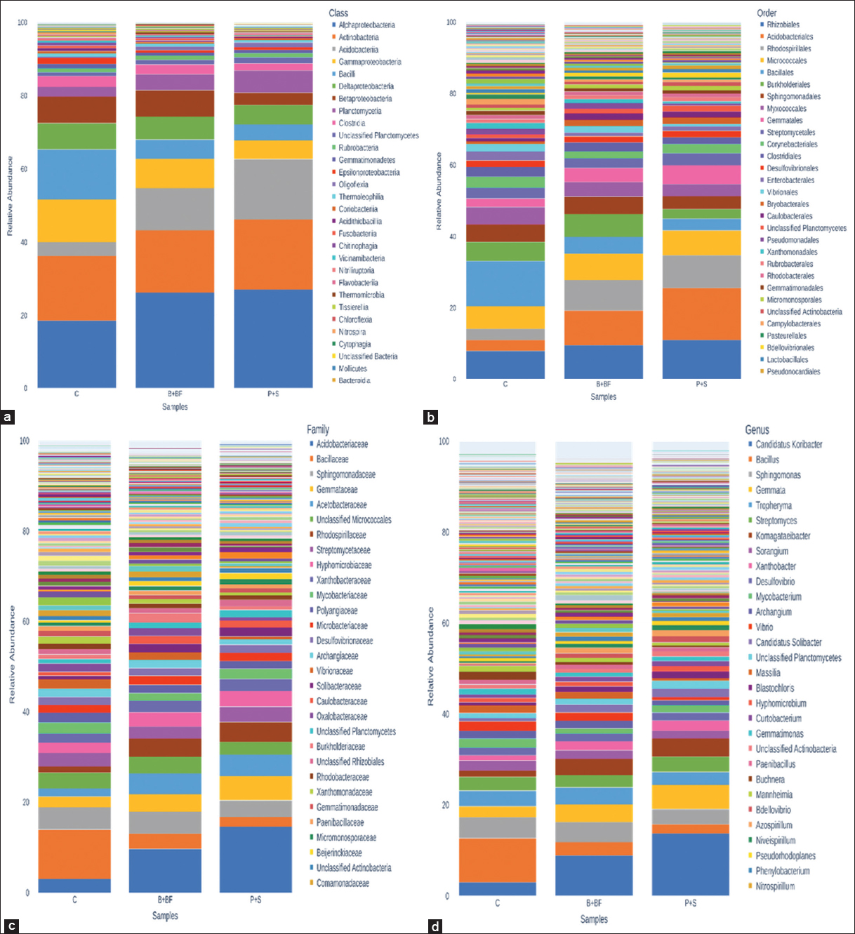 | Figure 4: Relative abundance of bacterial taxonomic groups across treatments: (a) Class (b) Order (c) Families and (d) Genus. Treatments include Control (C), Burkholderia-inoculated (B+BF), and Pseudomonas-inoculated (P+S) samples. Error bars indicate standard deviation (n = 3). Statistical significance was assessed using ANCOM, with P-values < 0.05 considered significant.