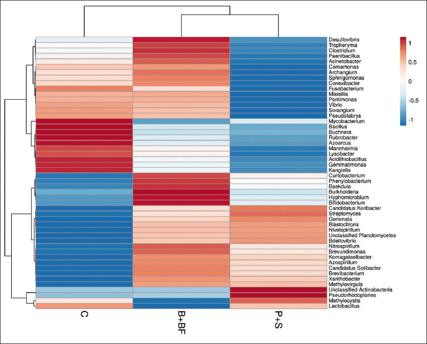 | Figure 6: Heatmap of bacterial genera abundance across treatments: Control (C), Burkholderia-inoculated (B+BF), and Pseudomonas-inoculated (P+S). The color gradient represents Z-score normalized relative abundance, with red indicating higher abundance (Z > 0) and blue indicating lower abundance (Z < 0) across samples, as shown by the scale bar on the right. The dendrograms were generated using hierarchical clustering based on Euclidean distance and complete linkage method. The vertical dendrogram (left) groups genera with similar abundance patterns, while the top dendrogram clusters treatment groups based on similarities in microbial community composition. Distinct clustering patterns suggest shifts in microbial community structure in response to bacterial inoculation.
