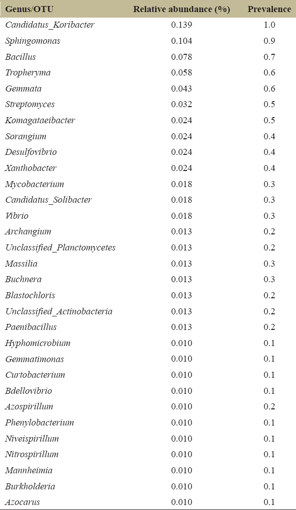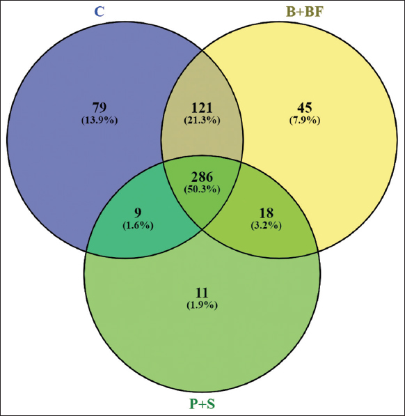 Venn diagrams showed that the three samples had unique and overlapping OTUs with the Burkholderia-inoculated sample, having the most unique taxa (45 OTUs; 7.9%) [Figure 7]. The number of OTUs that were found only in the B. dolosa-treated sample was 119 with the present sequencing depth. Fisher’s exact test showed that there was high presence of unique OTUs in B. dolosa when compared to the presence of unique OTUs in the other treatments (P < 0.05). No statistical analysis of exclusivity was undertaken to classify these OTUs: this is given as descriptive results. Many of these OTUs belonging to several different genera, such as Rhizobium, Parvibaculum, and Paenibacillus, have previously been linked to nutrient cycling, phytohormone production and suppression of plant pathogens. The ample overlap between microbial communities across treatments was represented by the largest shared group, including 286 OTUs (50.3%), or the core of OTUs across all treatments. A conserved core consisted of genera present in all samples (and associated with a prevalence of at least 20% and abundance at least 0.01%) and highlighted enrichment of volatile taxa in well-treated soils [Table 2].