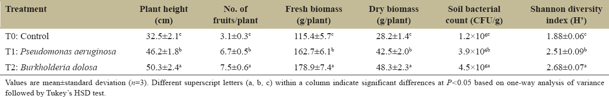 | Treatment | Plant height (cm) | No. of fruits/plant | Fresh biomass (g/plant) | Dry biomass (g/plant) | Soil bacterial count (CFU/g) | Shannon diversity index (H’) |