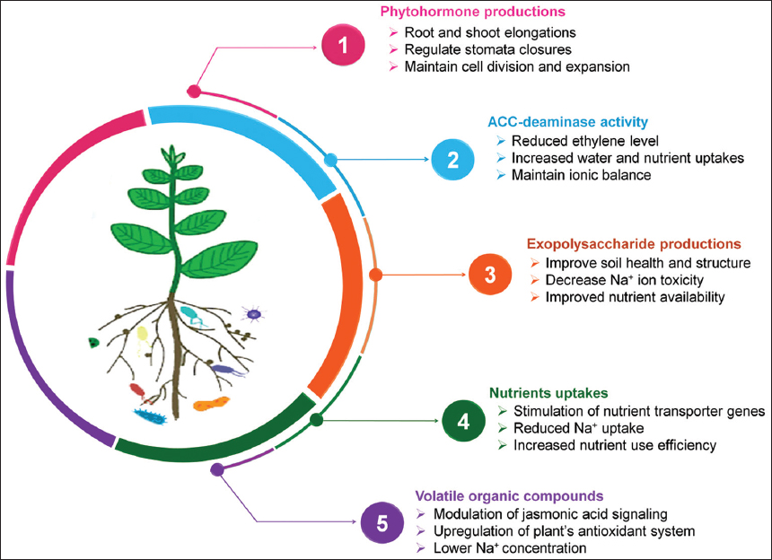 Many stress adaptive microbes are reported to produce phytohormones, exopolysaccharides (EPS), and 1-aminocyclopropane-1-carboxylate (ACC) deaminase enzyme that helps plants to thrive under stressed conditions [Figure 1]. In a study, Ayaz et al. [19] demonstrated that plants inoculated with a salt-tolerant Bacillus strain under stress conditions considerably overexpressed genes linked with auxin (ARF), CKX2, and ethylene encoded genes. The ACC deaminase enzymes play an important role in stress mitigation and thus increase plant growth. The detailed analysis of the AcdS gene encoding for ACC deaminase reveals its occurrence in a range of beneficial microbes [20]. EPS produced by the microbes connect Na+ cations, which decreases their amount around the plant root zone, thus serving in ionic balance maintenance. They also help in water retention, soil aggregation, and metal ion chelation in plants under salt stress [21]. The presence of the complete eps gene cluster has been investigated in the chromosomal DNA of Streptococcus thermophilus. Among all eps gene clusters, epsA, B, C, and D genes were extremely conserved and were accountable for EPS regulation and polymerization [22].