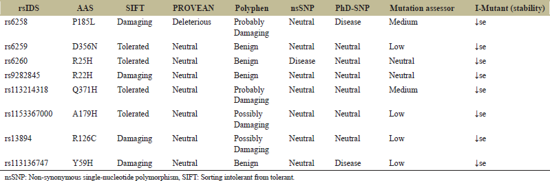 | Table 1: Prediction of the effect of nsSNP by various tools. [Click here to view] |