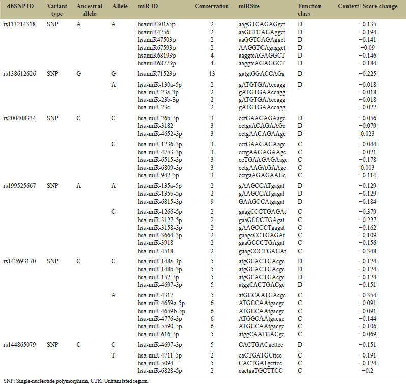 | Table 4: Predicted results of functional 3’UTRs SNPs/Indels. [Click here to view] |