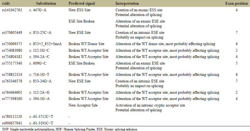 | Table 5: Effect of splice sites associated SNP predicted by HSF. [Click here to view] |