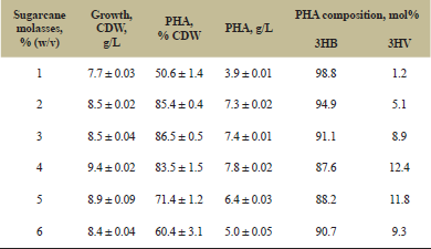 Influence of different concentration of sugarcane molasses on growth, production of the copolymer and 3HV monomer (mol%) incorporation was elucidated. Addition of molasses at 4% (w/v) level in the growth medium showed maximum production of P(3HB-co-3HV) (7.8 g/L) with the incorporation of 12.4 mol% 3HV monomers (Table 1). However, the PHA content of the cell mass (83.5%, CDW) was lower than those grown in 3% (w/v) molasses. Further increase in molasses concentration showed a negative effect on biomass formation, polymer accumulation as well as 3HV monomer incorporation in the copolymer and corroborated well with the findings of Zafar et al. [12].