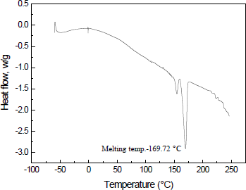 ![]() | Figure 6: DSC curve showing melting temperature (Tm) of purified copolyester P(3HB-co-3HV) produced by the endophytic isolate B. cereus RCL 02. [Click here to view] |