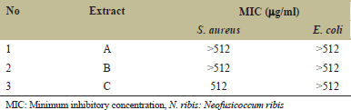 Screening of antibacterial activity of N. ribis extract against S. aureus and E. coli is shown in Figure 3. It was indicated that extract derived from methanol partitioned with ethyl acetate (C) was the most active extract against S. aureus compared to A and B, while extract B and C also active against E. coli.