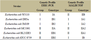 Hybridization experiments with specifically targeted gene sequences to safely differentiate lineages of Escherichia coli strains, including Escherichia coli K-12, as well as sequencing of this genome, are described in the literature [1,4,5,16,28]. Published studies demonstrate results on the genetic identification of Escherichia coli K-12 in an industrial wastewater treatment effluent pond [28] and in industrial biotechnological process samples [1] based on Multiplex-PCR according to protocol described by Kuhnert et al. (1995) [16]. With the increasing advancement in contemporary methodologies based on a genomic and proteomic approach to identify microorganisms, it is possible to find competitive alternatives to determine the origin and differentiate the lineages of Escherichia coli strains. The Biotechnology industry where the study was carried out uses Escherichia coli W3110 lineage to produce a recombinant protein in accordance with all legal biosafety requirements. The development of advanced and competitive methodologies that differentiate Escherichia coli W3110 strain from wild and or pathogenic Escherichia coli is desirable in the concerned industry. Aiming at the elaboration of an alternative protocol for identification of Escherichia coli W3110, differentiating it from wild lineages, a total of 06 Escherichia coli strains were used in the genomic (ERIC-PCR) and proteomic (MALDI-TOF) analyzes of the present study. Among them, 04 Escherichia coli K-12 (DH5α, JM109, MC1061, W3110), 01 Escherichia coli strain derived from B cell (BL21DE3+) and 01 non-K-12 strain (Esherichia coli ATCC8730).